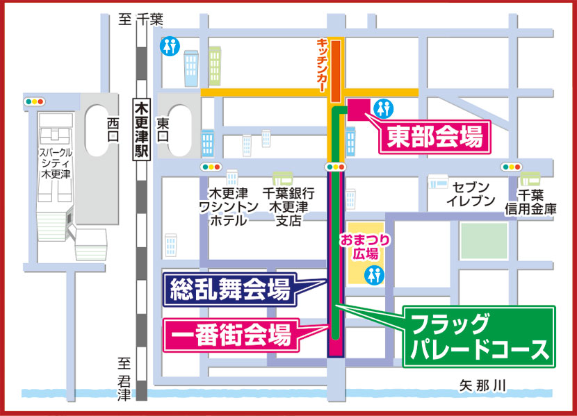 木更津市/君津市/富津市/袖ケ浦市/木更津市教育委員会/君津市教育委員会/富津市教育委員会/袖ケ浦市教育委員会/木更津商工会議所/(一社)木更津市観光協会/(一社)かずさ青年会議所/木更津市商店会連合会/大和町親交会/広域交流市民の会/木更津商工会議所青年部/木更津工業高等専門学校/木更津総合高等学校(君津学園)/拓殖大学紅陵高等学校/木更津東高等学校/JR東日本木更津駅/清和大学/きみつnet/木更津市交通安全協会/かずさFM83.4/bayfm78/さつき通り田面商店街/はぎわら病院